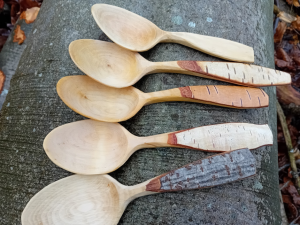 Hazel and birch spoons with the bark left on the handles – all from coppicing or scrub clearance.